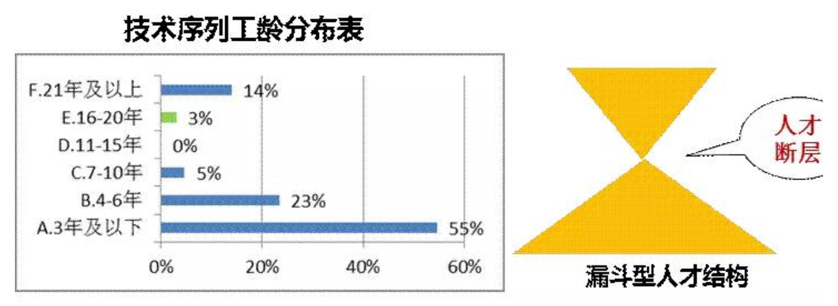 聪明的读者发现了,这个企业的技术人员,工龄在6年以上的不到20%,3年以下工龄的占到55%,而在工龄11-15年的出现了断层,还值得注意的是21年及以上工龄的人又达到了14%。