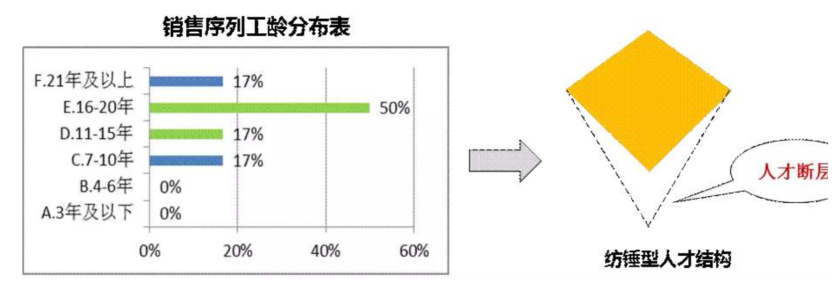 6年及以下人员出现了明显断层,数量为零。而16-20年工龄的人员占了该企业营销人员比重的50%。