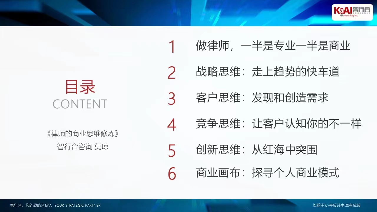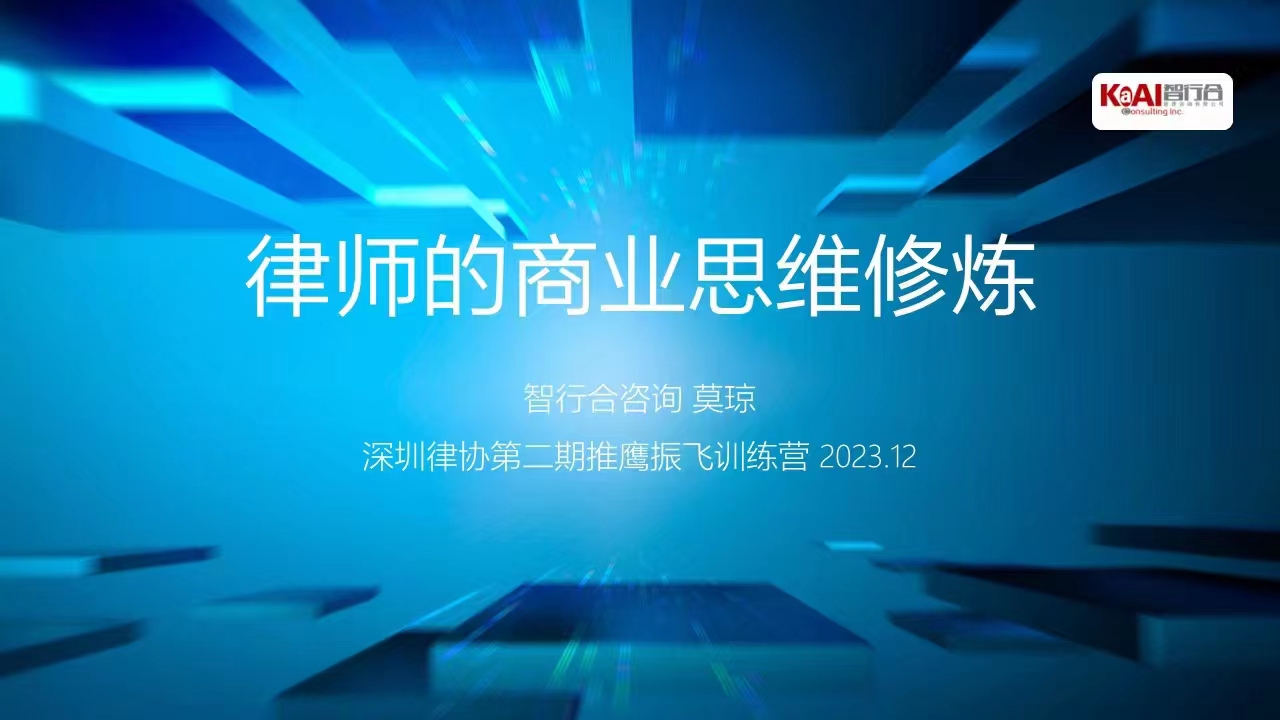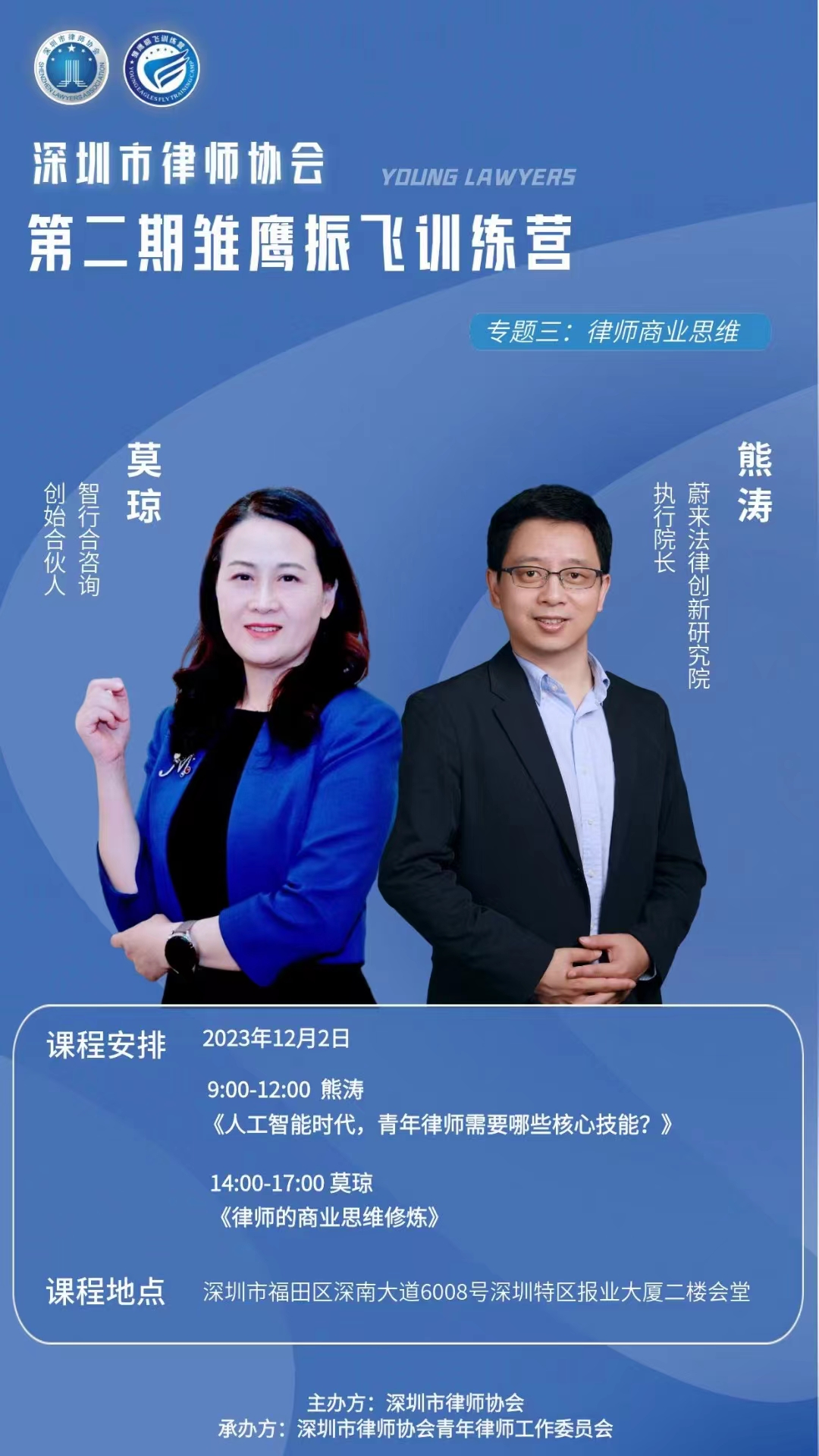 2023年12月2日,智行合获邀在深圳律协主办的第二期雏鹰振飞训练营主讲了《律师的商业思维修炼》课程,莫琼女士获得优秀导师荣誉。